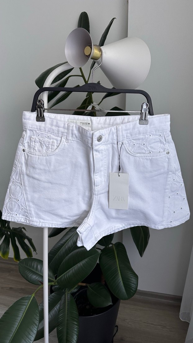 Düğmeli, nakış detaylı, bol kesim beyaz kot mini şort, günlük sokak tarzına uygun. Ürün orijinal sıfır ve etiketlidir