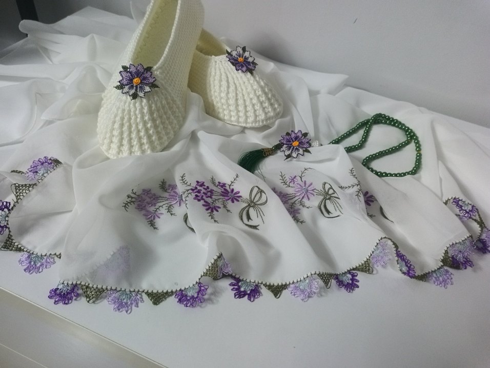Beyaz kısa örgü terlikler ve mor çiçek nakışlı şal seti. Terlikler rahat bol kesim olup, her iki parça da ince el işi nakış detaylıdır.