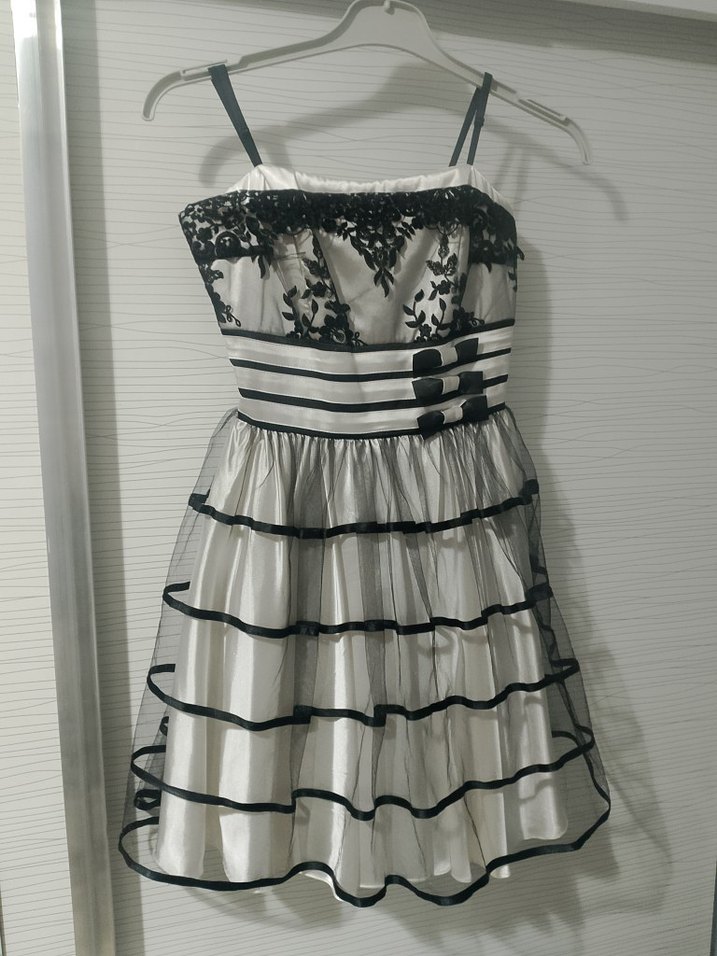 Beyaz, siyah nakışlı detaylara sahip straplez, askılı ve fırfırlı mini elbise. Vintage gotik tarzıyla parti için uygun, vücuda oturan kesim.