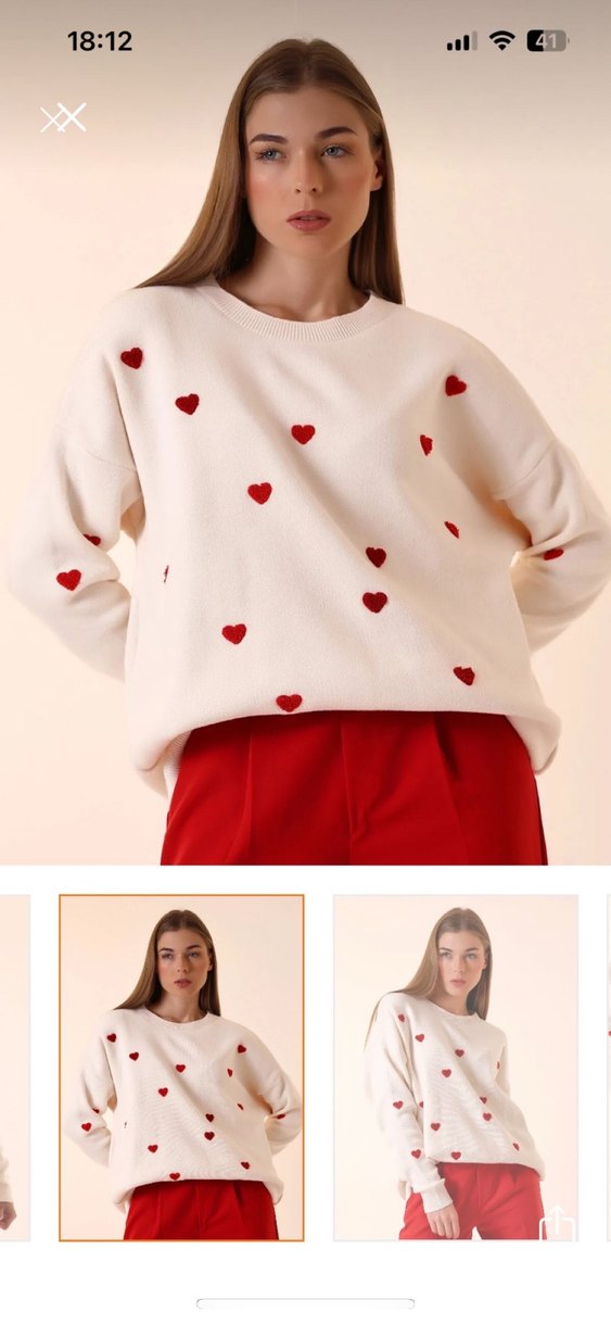 Nakışlı kırmızı kalplerle süslenmiş beyaz triko kazak, bol kesim, yuvarlak yaka ve uzun kolludur, romantik akşamlar için uygundur.
