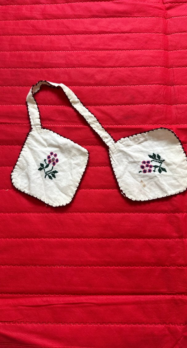 Beyaz bebek önlüğü, renkli çiçek nakışlarıyla süslenmiş ve basit askılı tasarıma sahip. Yumuşak ve hafif yapıda.
