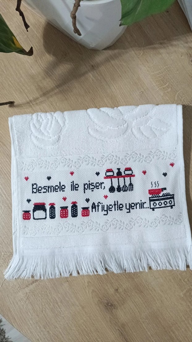 Nakışlı desenli, "Besmele ile pişer, Afiyetle yenir" yazılı beyaz mutfak havlusu. Hafif kumaş ve püskül detayına sahiptir. ️