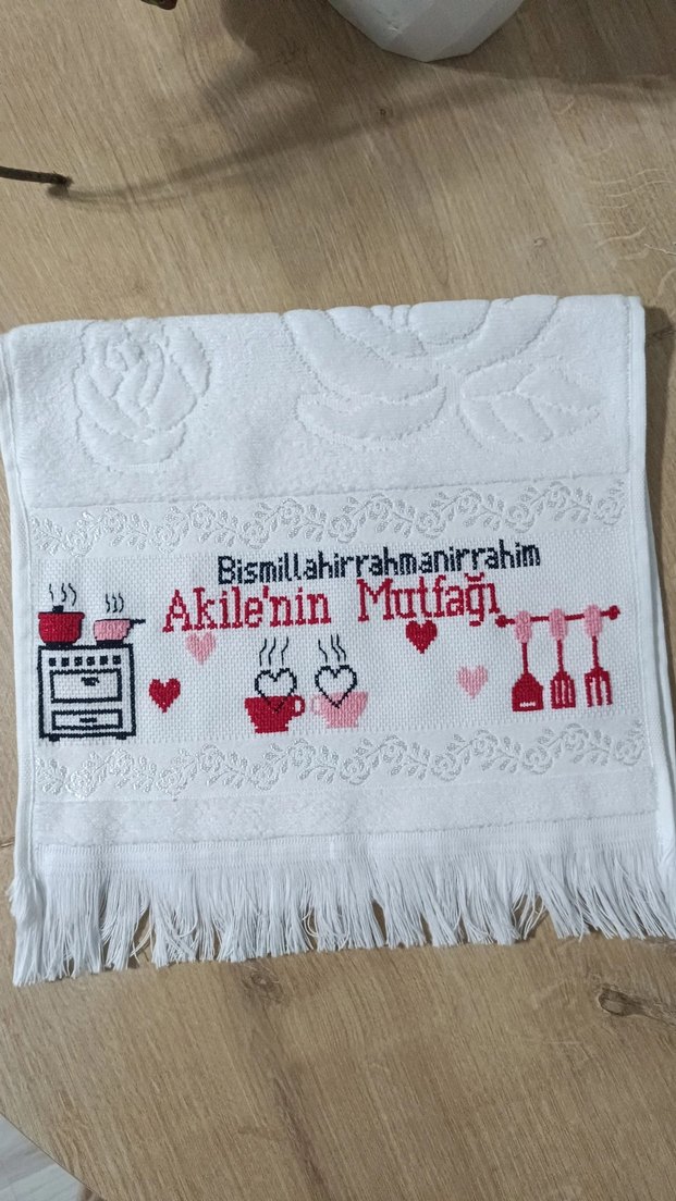 Nakışlı, mutfak temalı yazısı ve desenleri olan beyaz mutfak havlusu. Yumuşak kumaş, püsküllü kenarlar. ️