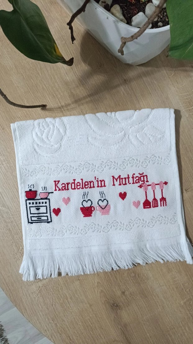 Nakışlı soba, fincanlar ve mutfak gereçleri desenli beyaz mutfak havlusu, "Kardelen'in Mutfağı" yazılı, yumuşak dokulu ve püsküllüdür.