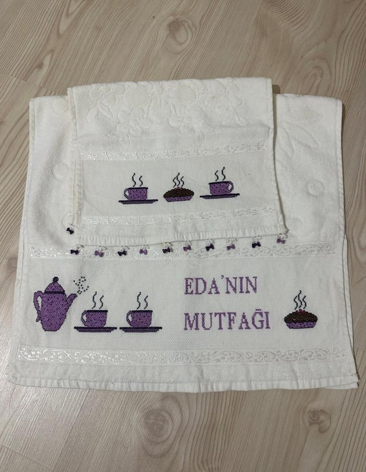 Mor kahve fincanları ve çaydanlık nakışlı beyaz mutfak havlusu seti, "EDA'NIN MUTFAĞI" yazılı.