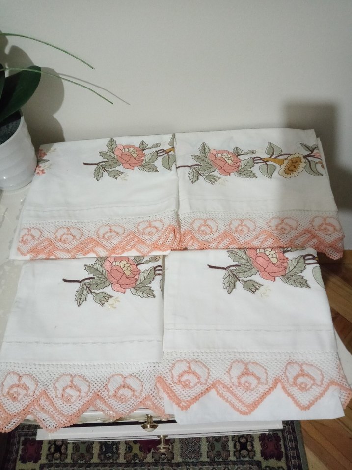 Nakışlı çiçek desenleri ve ince dantel detayları bulunan iki etek iki yastık hiç kullanılmadı.