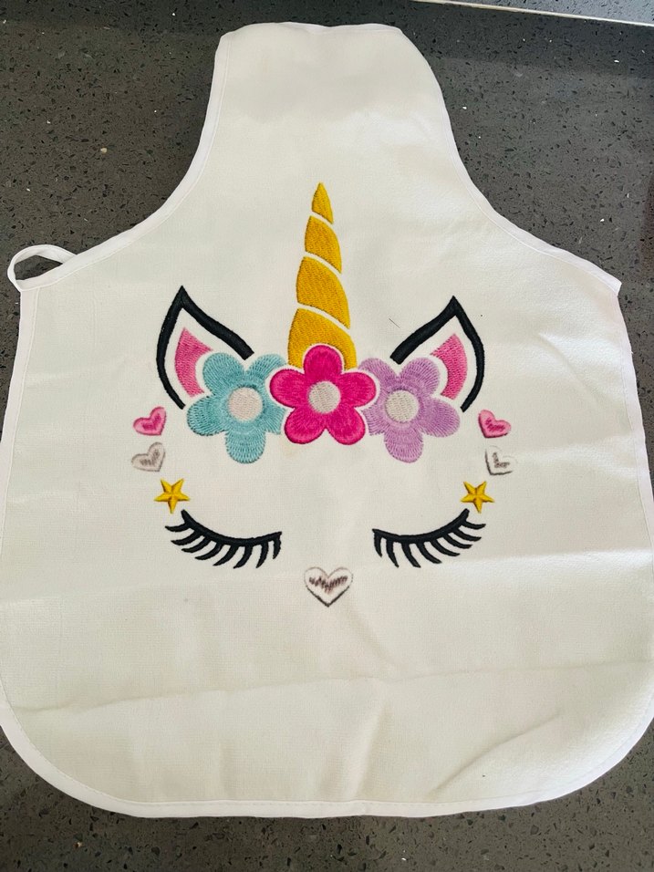 Pastel renkli nakışlı tek boynuzlu at ve çiçek desenine sahip beyaz mutfak önlüğü. Yemek yaparken koruma sağlar.