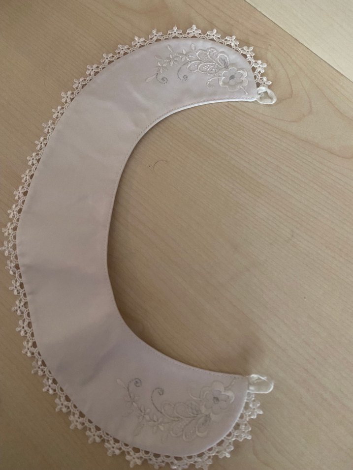 Gri ve beyaz tonlarında, nakışlı ve dantelli kenarlıklı önlük yakası nostalji
