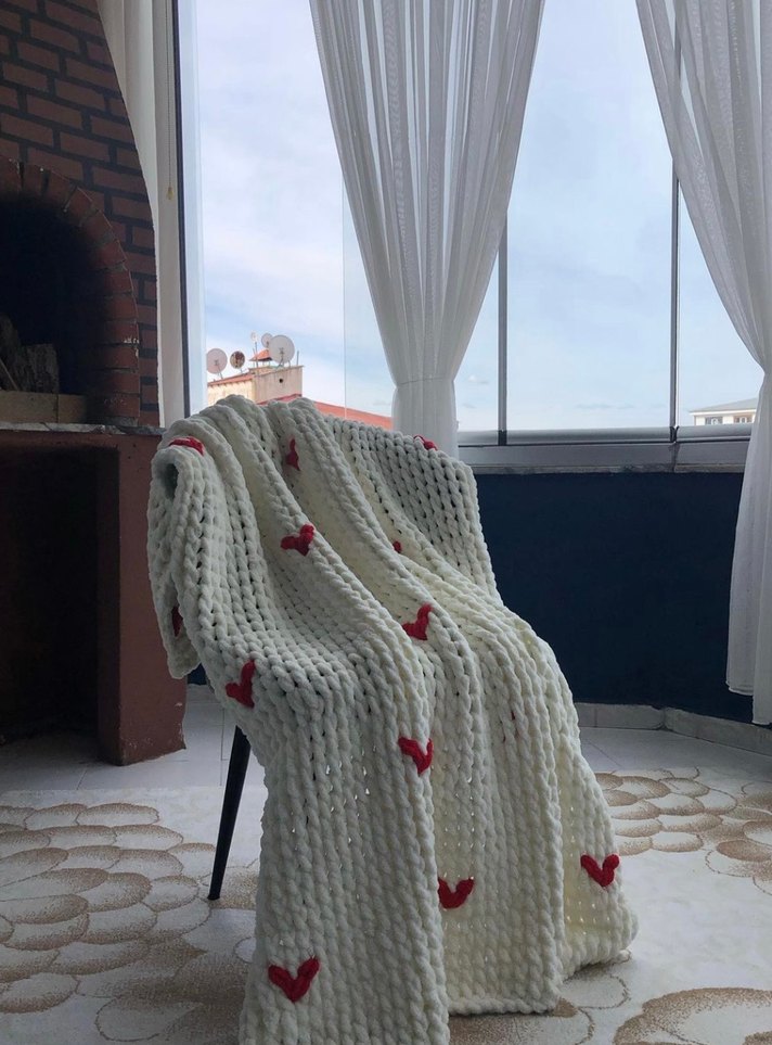 Kalın örgü dokusuna sahip açık beyaz battaniye, nakışlı kırmızı kalp detaylarıyla sıcak ve dekoratif bir görünüm sunar.