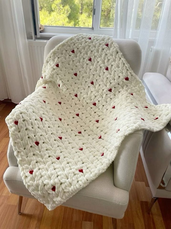 Bu beyaz battaniye, küçük kırmızı nakış detaylarıyla kalın örgü dokusuna sahip, hem sıcak hem dekoratif bir üründür.
