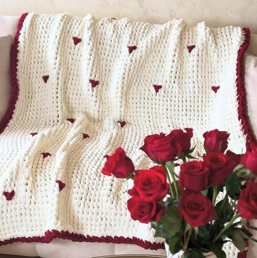 Nakışlı kırmızı detaylara sahip beyaz örgü battaniye, dokulu deseniyle sıcak ve dekoratif bir görünüm sunar.