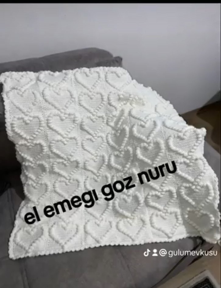 Gri nakışlı kalp desenleriyle beyaz örgü bebek battaniyesi. El emeğiyle özenle hazırlanmış, yumuşak ve rahat dokusu vardır. ✨sipariş alıyorum