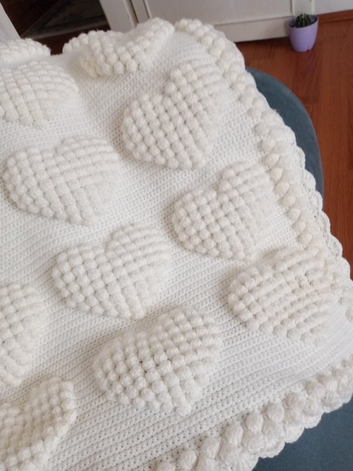 Nakışlı kalp desenleri ve dokulu kenar süslemeleriyle beyaz örgü bebek battaniyesi, çocuklar için yumuşak ve rahat bir dokunuş sunuyor. tamamen el emegidir 12 yumak ipten yapılmış sıfır ürün