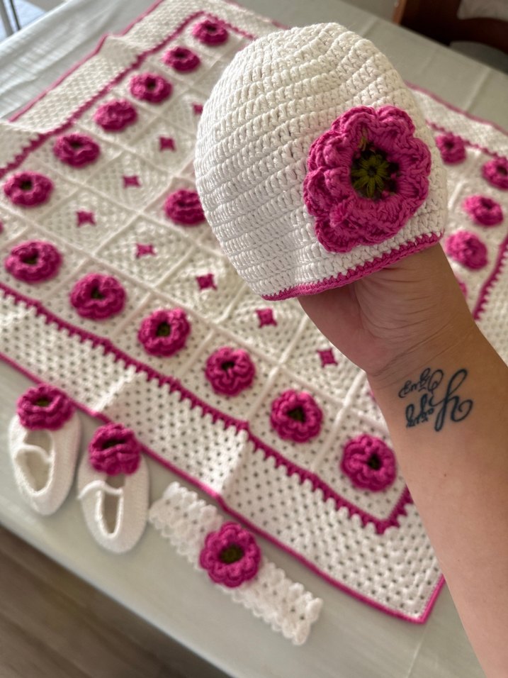 Sıfır ürün. Nakışlı renkli çiçek detaylı beyaz örgü bebek bere, bohem ve retro tarzda. Aynı desende aksesuar setiyle birlikte.