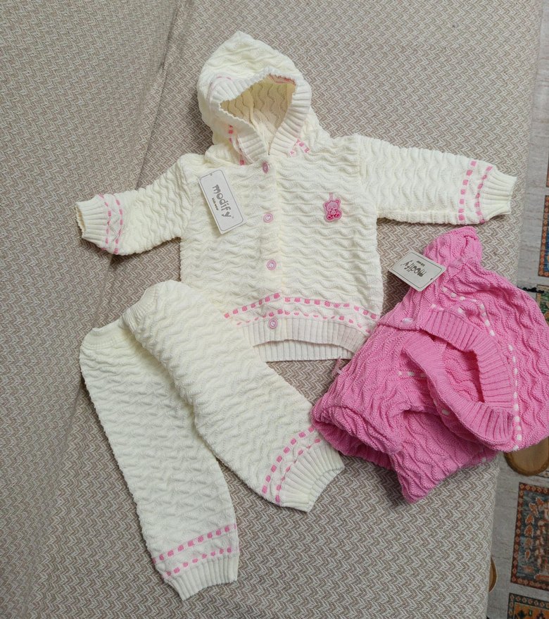Nakışlı ve renkli detaylara sahip örgü beyaz bebek kız takımı. Kapüşonlu üst ve uyumlu pantolon ile yumuşak dokulu.