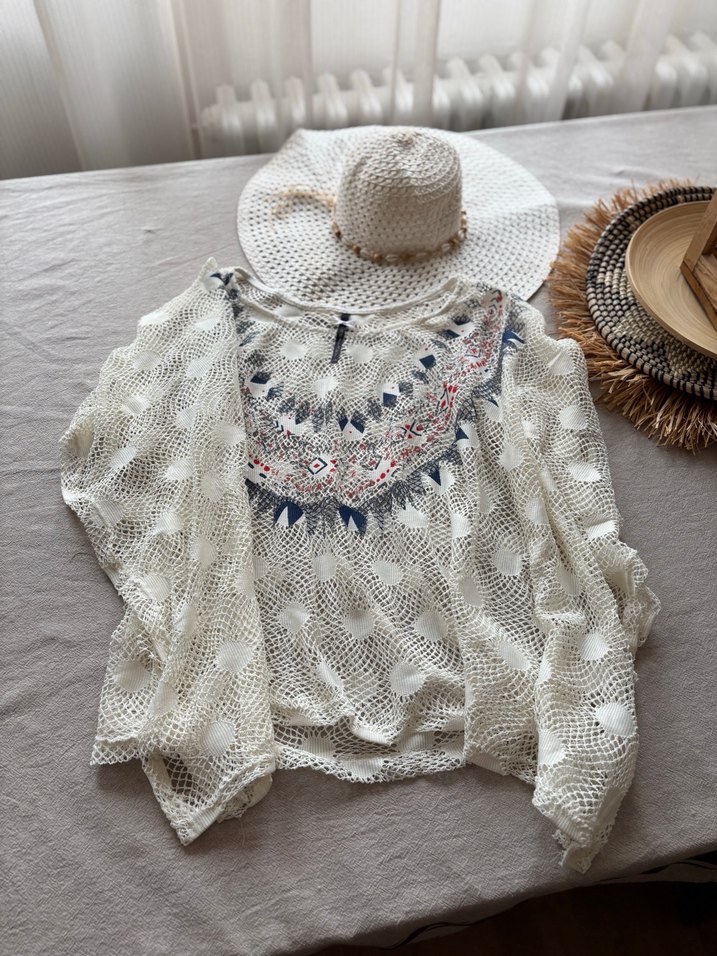 Beyaz örgü bohem kadın panço, nakışlı desenlerle süslenmiş, bol kesim ve kısa boyda, uzun kollu ve kayık yaka detaylıdır. Şapka dahildir. Sararan yerleri var şapkanın ama pek belli olmuyor