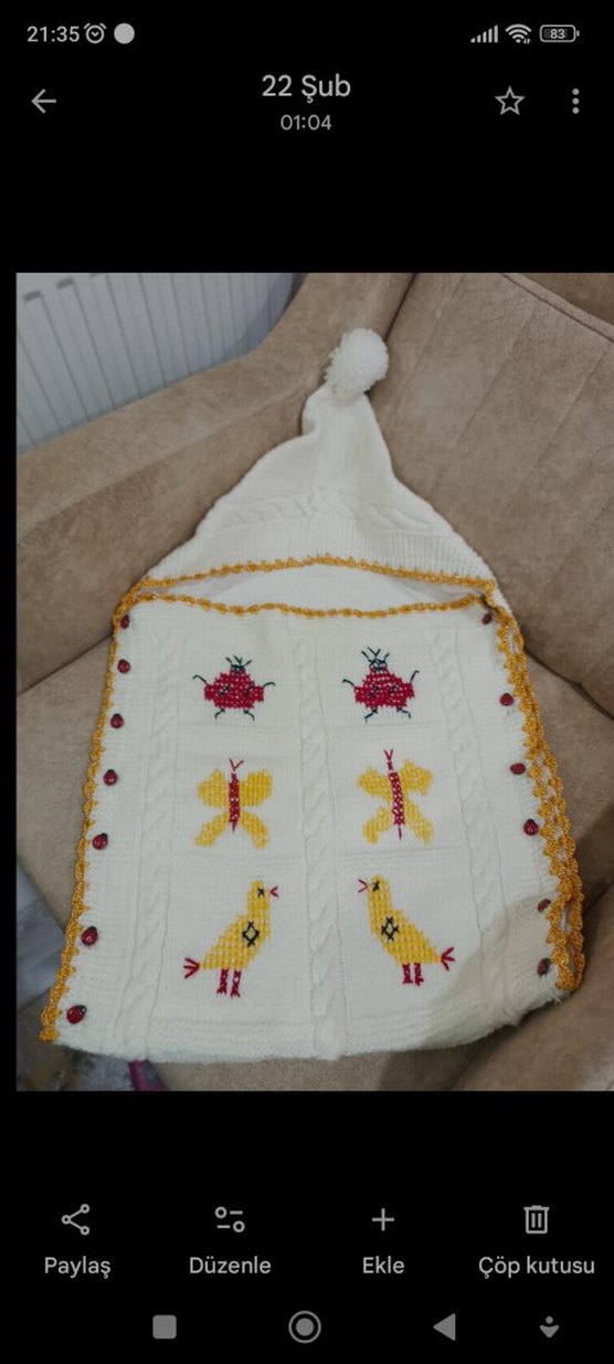 Nakışlı kırmızı uğur böcekleri, sarı kelebekler ve kuş desenli beyaz örgü çocuk battaniyesi, sarı kenarlık ve kapüşonunda ponpon bulunur.
