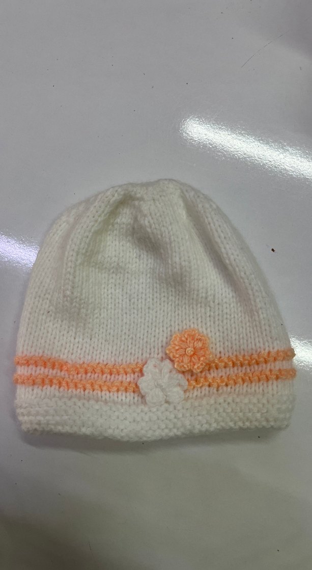 Nakışlı renkli çiçekler ve çizgilerle süslenmiş beyaz örgü çocuk beresi, sade ve şirin bir görünüm sunar.