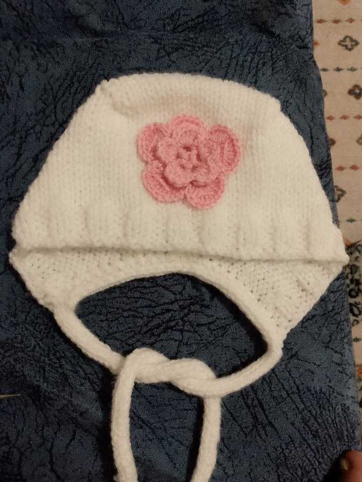 Pembe nakışlı çiçek detaylı beyaz örgü çocuk bere, bağlama ipleri ile rahat kullanım sağlar. Yumuşak dokulu ve bohem tarzda.