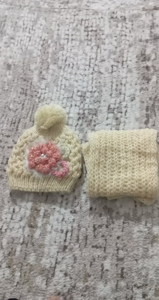 Çocuklar için beyaz örgü bere ve ponponlu, nakışlı pastel çiçek detaylı, yanında uyumlu örgü atkı içeren bohem tarz set.