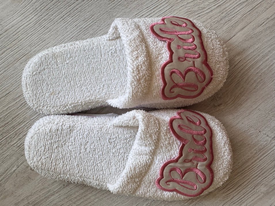 Yumuşak tüylü kumaştan, renkli nakışlı "Bride" yazılı beyaz terlik. Ufak bir sararma lekesi var hafif çok az belirgin çekimde bir kez giyildi