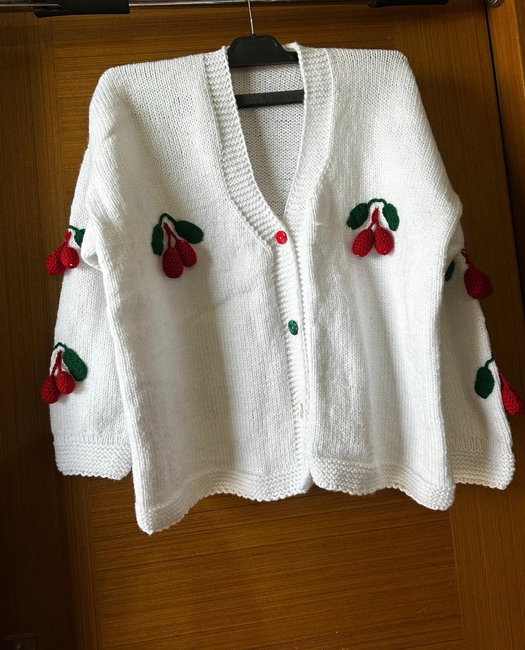 Nakışlı kiraz detaylı beyaz örgü hırka, uzun kollu ve kısa boylu, bol kesim ile rahat ve retro bir stil sunar.