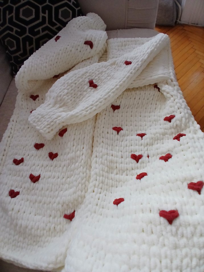 Yumuşak beyaz örgü hırka , üzerinde kırmızı nakışlı kalp desenleriyle sıcak ve dekoratif bir görünüm sunar. istenilen ölçü de yaparım sipariş oluşturmadan mesaj atın