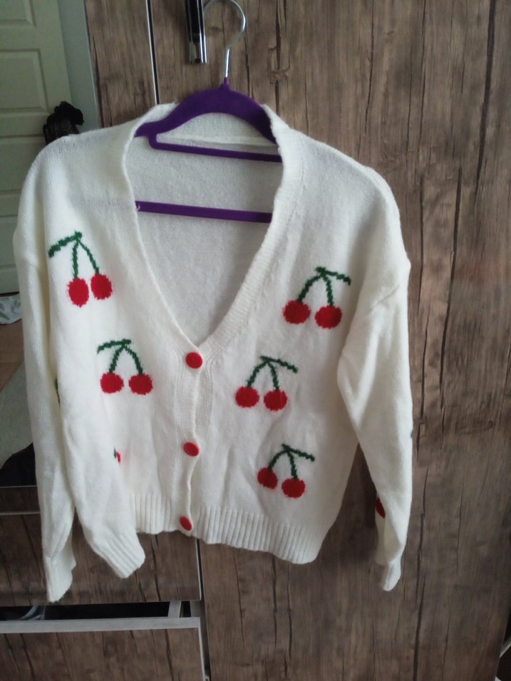 Nakışlı kiraz desenli beyaz örgü kadın hırka, V yaka ve uzun kollu, bol kesimiyle rahat ve bohem bir tarz sunar.
