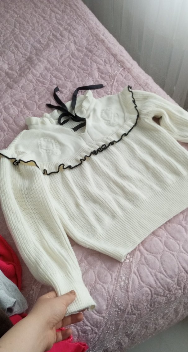 Nakışlı desenlere sahip beyaz örgü kazak, uzun kollu ve yakalıdır. Salaş kesimi ve siyah detaylarıyla gündelik kullanıma uygun rahat bir modeldir.