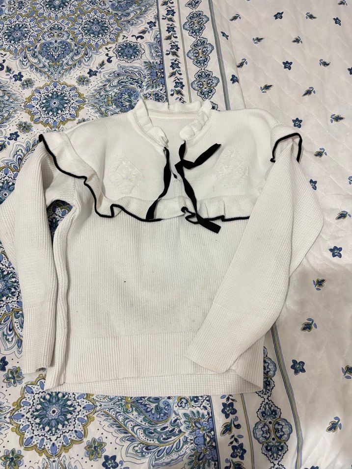 Beyaz örgü kazak, uzun kollu ve yakalıdır. Nakışlı detaylar ve siyah şeritlerle süslenmiş, rahat ve bol kesimdir. Paris tarzı günlük sokak giyimi için uygundur.
