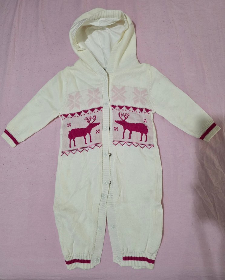 6-9 AY/ TRİKO ÇITÇITLI KIZ BEBEK İÇİN UYGUN KAPÜŞONLU (içi terletmez penyedir) sorunsuz tulum, hiç kullanılmamıştır. Nakışlı renkli desenlere sahip beyaz örgü kız bebek tulumu, kapüşonlu ve çıtçıtlıdır. ❄️