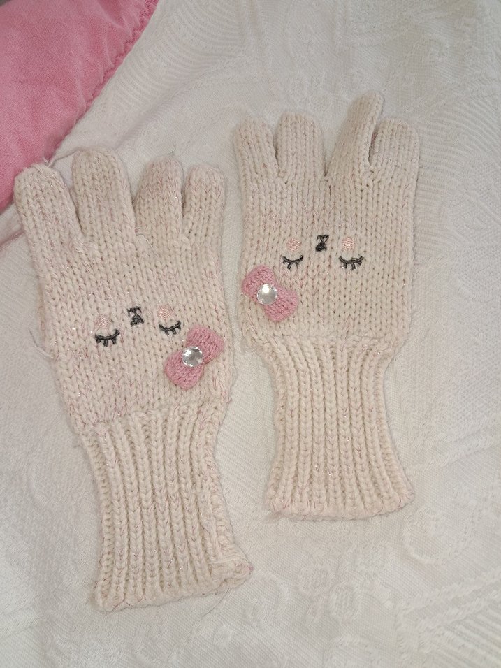 Nakışlı uyuyan gözler ve küçük taşlı pembe fiyonk detaylı beyaz örgü eldivenler, bohem ve retro tarzı yansıtıyor.
