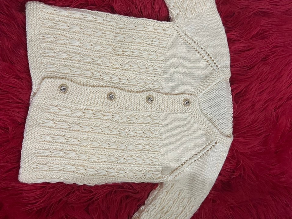Uzun kollu, nakışlı ve örgü dokulu, bohem tarzda simli krem renkli, vücuda oturan kız hırkası. Dekoratif düğmelerle tamamlanmıştır.