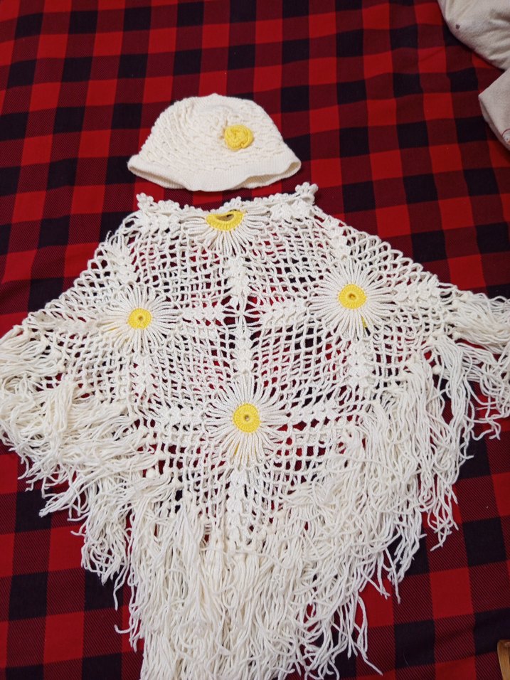 Nakışlı Beyaz Örgü Kız Panço ve Şapka