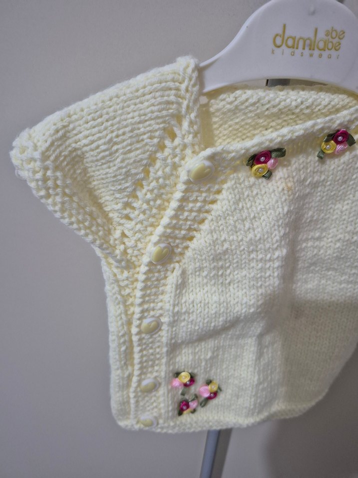Kolsuz, nakışlı ve bol kesim beyaz kız hırkası. Örgü kumaştan üretilmiş, bohem tarzda ve düğmeli kapamalı. yelek süveter 3 adet tanesi 100 tl
