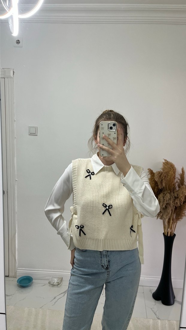 Beyaz örgü kumaştan,yandan bağlamalı bol kesim sokak stili kazak. Günlük kullanıma uygun.