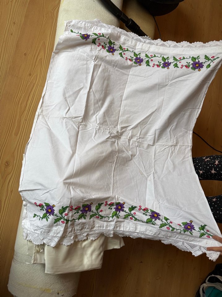 Kenarlarında nakışlı çiçek desenleri ve ince dantel süslemeleri bulunan beyaz örtü geleneksel bir görünüm sunar.
