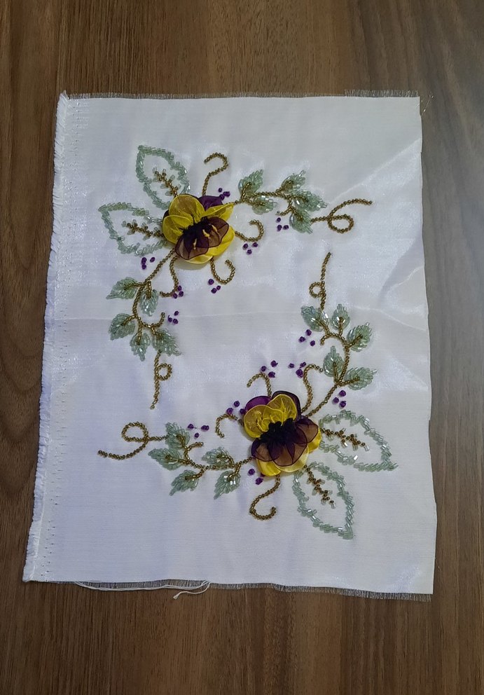 Nakışlı çiçek desenleri ve parlak detayları olan beyaz masa örtüsü, geleneksel tarzda işlenmiş.değerlendirmelik