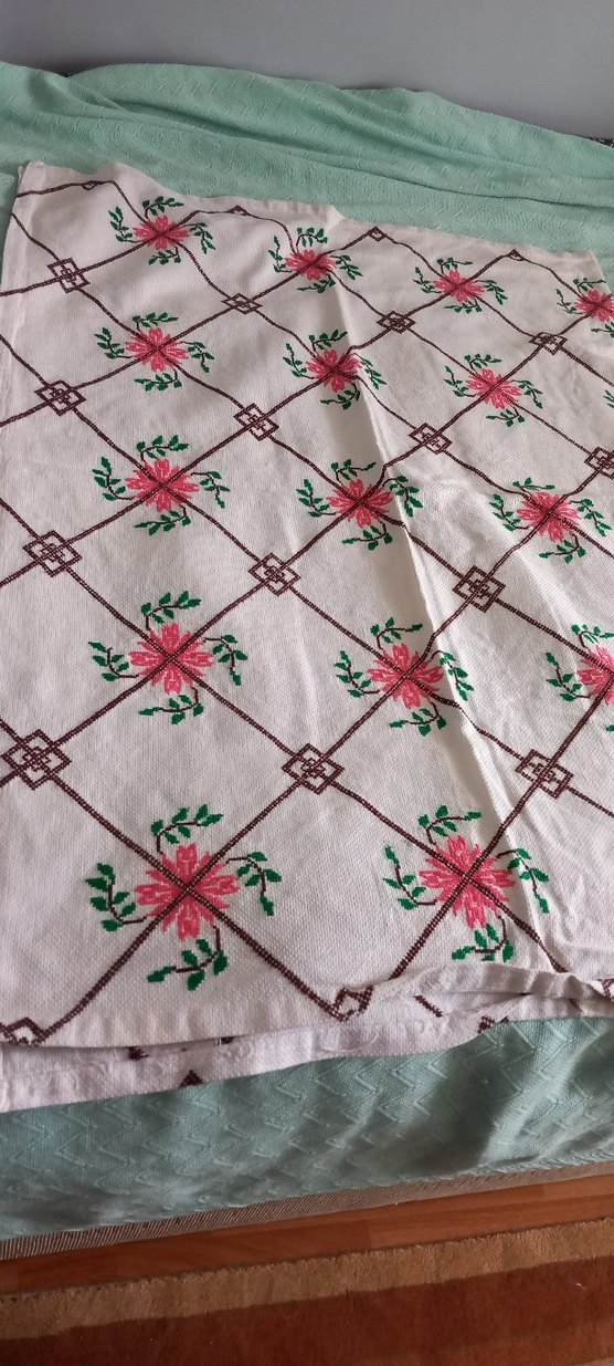 Nakışlı çiçek desenleriyle beyaz örtü pastel renklerde ve klasik tasarıma sahip. el yapımı sorunsuz
