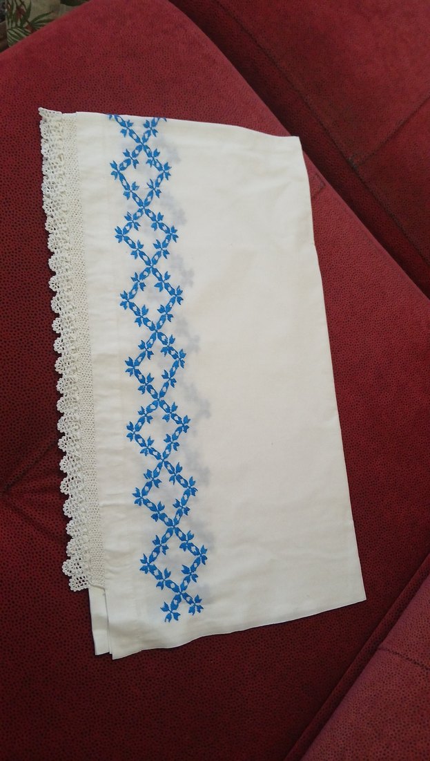 Beyaz yastık örtüsü, mavi nakışlı çiçek desenleri ve bir kenarında dantel süslemeye sahip klasik tarzda.