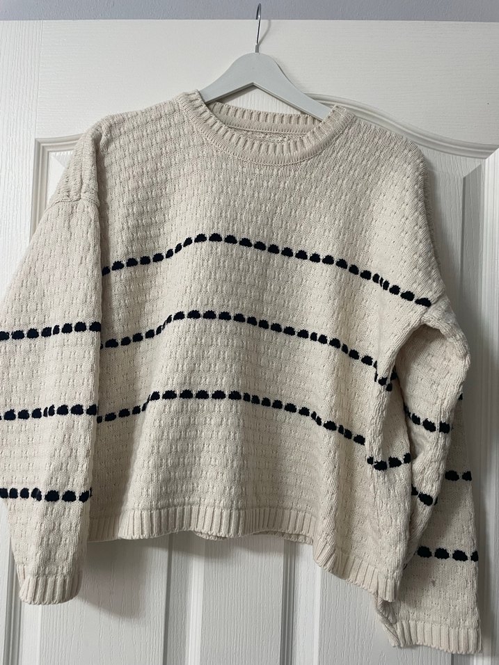 Nakışlı yatay çizgili beyaz triko kazak, oversize kesimi, uzun kollu ve yuvarlak yaka ile rahat bir görünüm sunar.