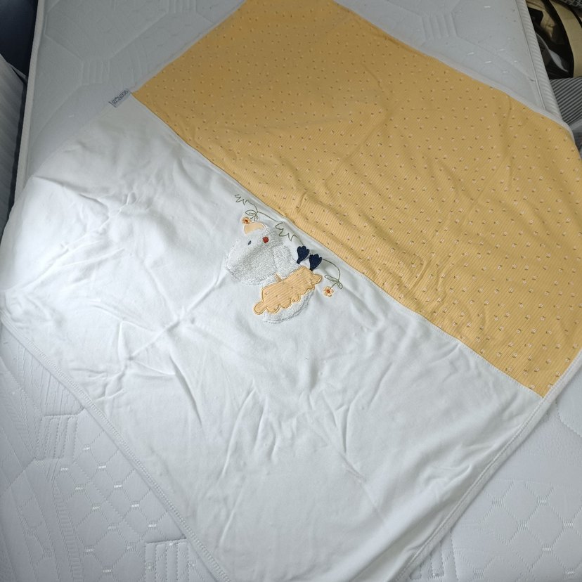 Pamuk kumaştan yapılmış, nakışlı detaylara sahip beyaz ve açık sarı renklerde çocuk battaniyesi.