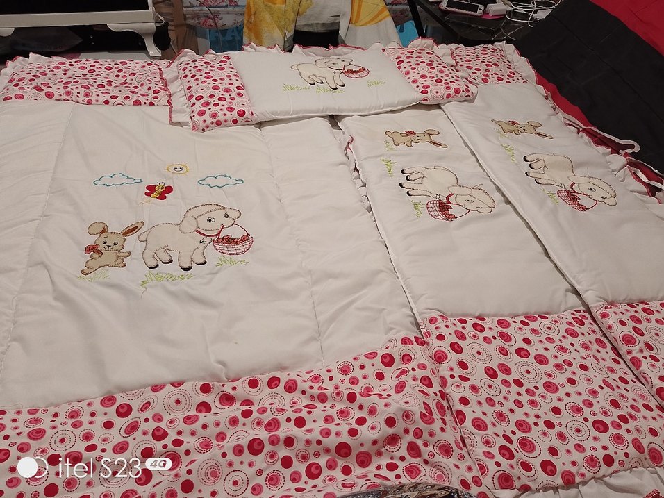 Renkli nakışlı, beyaz pamuk kumaştan yapılmış çocuk uyku seti. Pembe desenli kenarları ve sevimli hayvan figürleri bulunur.