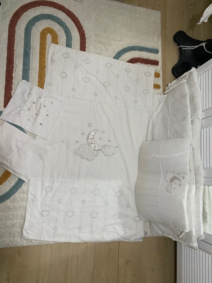 Yumuşak beyaz pamuklu kumaş üzerine nakışlı ay ve bulut desenleri bulunan bebek uyku seti, yastık ve uyku tekstili parçaları içerir.