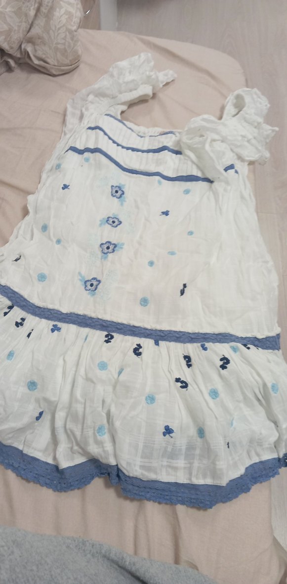 Nakışlı mavi çiçek desenleri ve fırfır detaylı, askısız yakalı, bol kesim beyaz pamuklu kız elbisesi, bohem tarzında. ham keten yurtdışı ürünü temiz içi astarlı