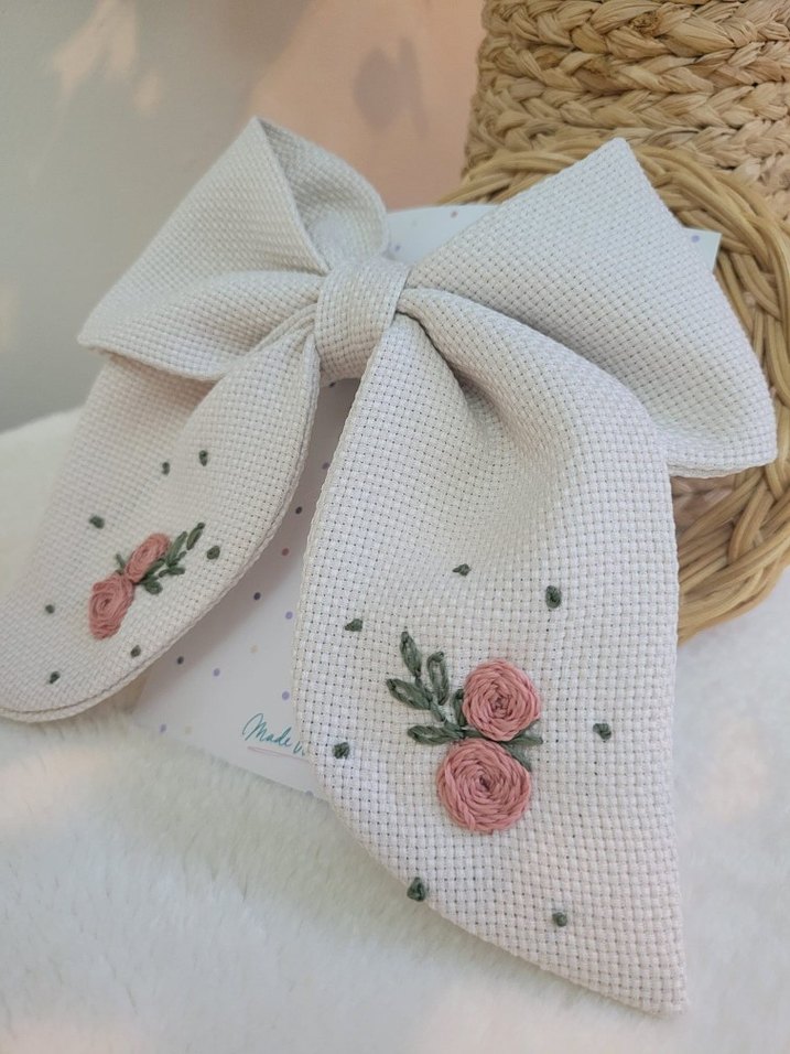Yumuşak dokulu beyaz pamuklu fiyonk saç aksesuarı, zarif çiçek nakışlarıyla bohem tarzı yansıtıyor.