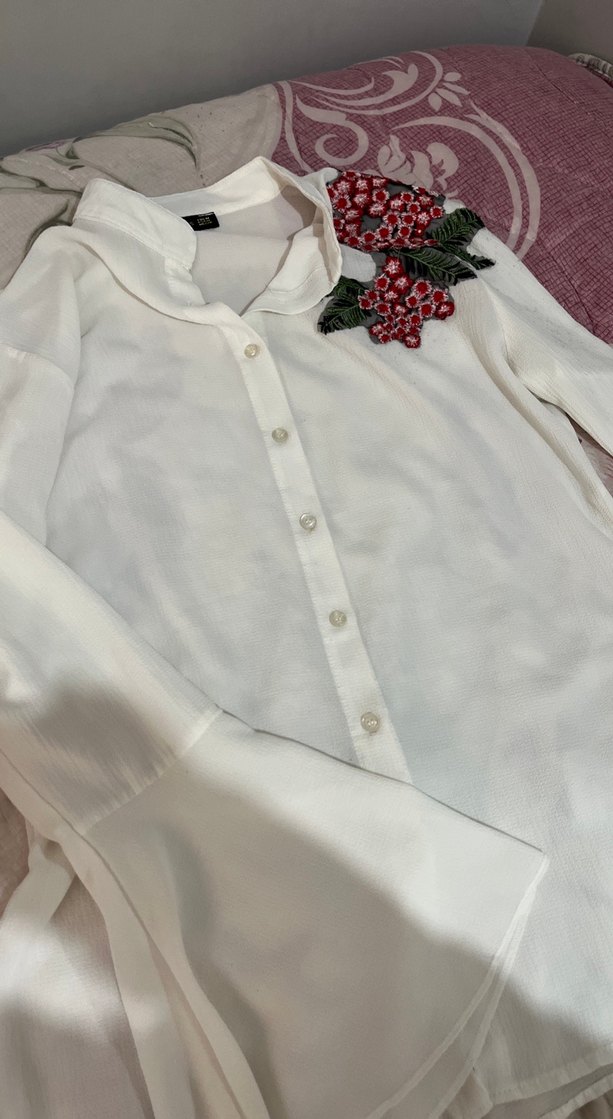 Pamuklu beyaz gömlek, yakalı ve düğmeli, uzun kollu. Omuzda nakışlı çiçek deseni ile bohem tarzda, rahat kesim, günlük şıklık için uygun.