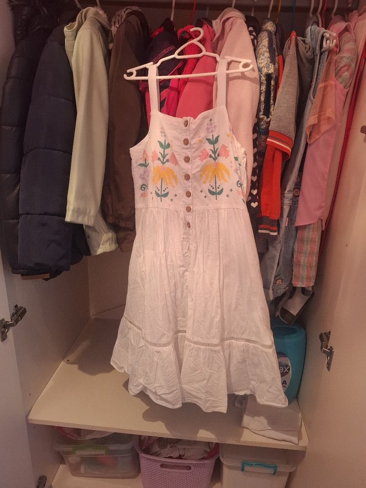 Nakışlı çiçek desenleri ve düğmeli beyaz pamuklu, askısız, kolsuz elbisedir. Bol kesim ve bohem tarzındadır.