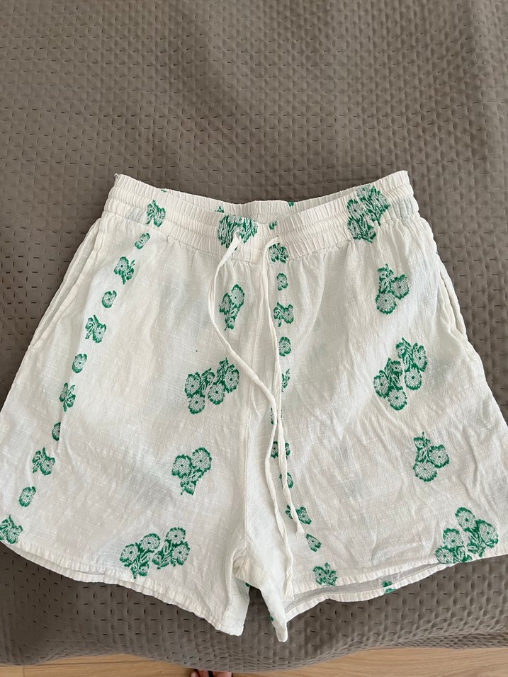 Yeşil nakışlı desenlere sahip beyaz pamuklu mini şort, bol kesim, düğmeli ve rahat bohem tarzda günlük kullanım için uygun.