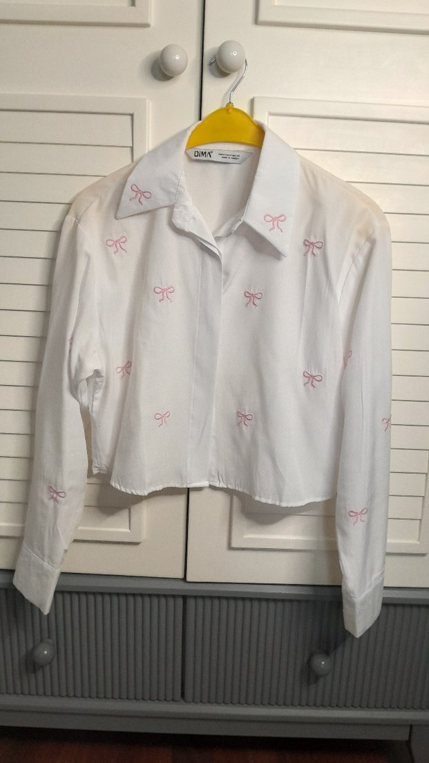 Bol kesim beyaz pamuklu gömlek, uzun kollu, yakalı ve pastel pembe nakışlı fiyonk detaylı. Düğmeli, midi boy, günlük sokak stili için uygun. #gömlek #beyazgömlek #cropgomlek #body #sweet #fiyonklugömlek